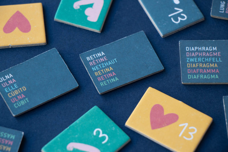 Ein Spiel, um die innere Schönheit zu entdecken und die 96 Teile des menschlichen Körpers auf spielerische Art zu lernen. Du ziehst ein Kärtchen, ordnest es einer der vier Körperteil-Karten zu und nennst den Namen des Körperteils. Wenn alles richtig ist, darfst du das Kärtchen behalten. Wenn niemand den Namen weiß, kann man auf der Rückseite nachsehen. Am Ende können auch diese ausstehenden Kärtchen noch gewonnen werden, wenn sie richtig benannt werden. Das Spiel ist in sechs Sprachen: Deutsch, Italienisch, Englisch, Französisch, Spanisch und Katalanisch.